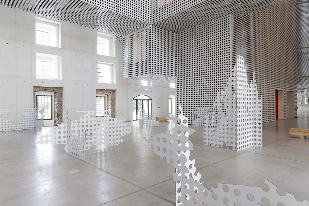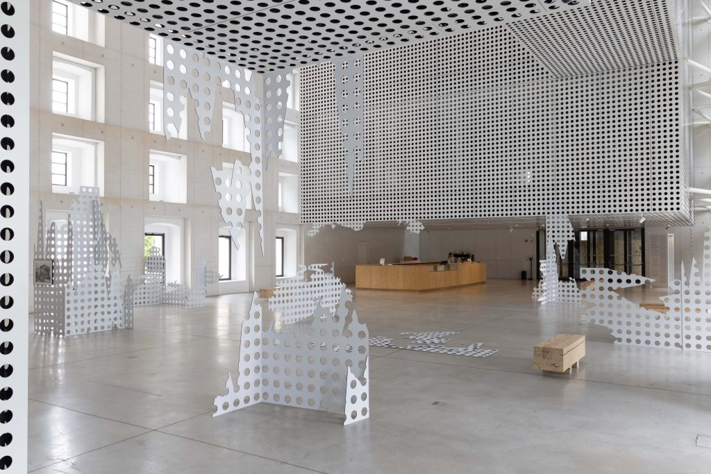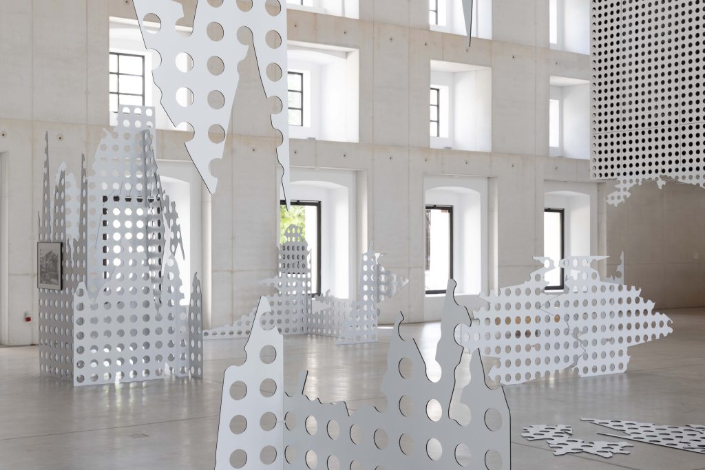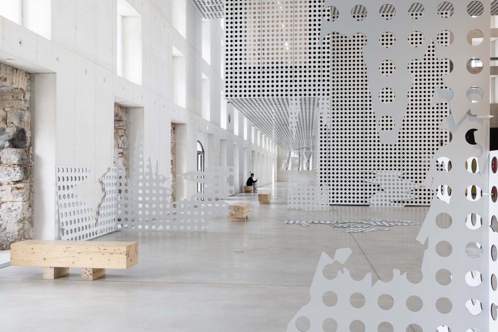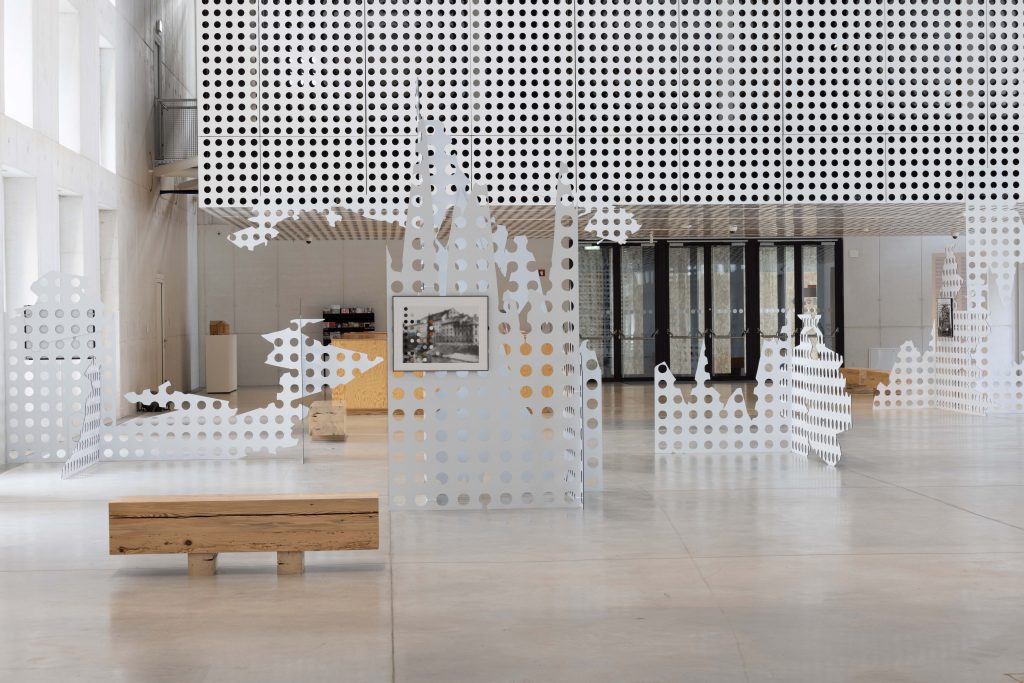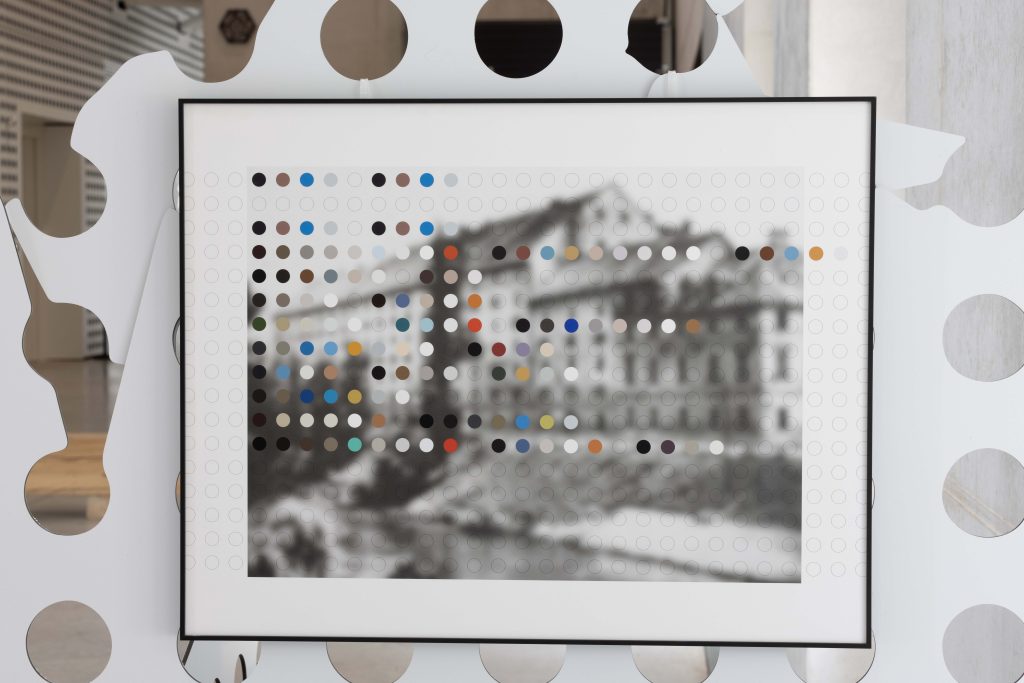 Panels from the main lobby of Cukrarna Art Center were deconstructed by simulating their fall from the top of the highest Slovenia mountain and assembled into sculptural constellations. Three framed prints were mounted to the panels, showing a low-resolution historical image of the Cukrarna building as one of the key places of Slovenian literary modernism. On top of the images, the dots represented three early 20th-century poems by Aleksander Murn translated into color.