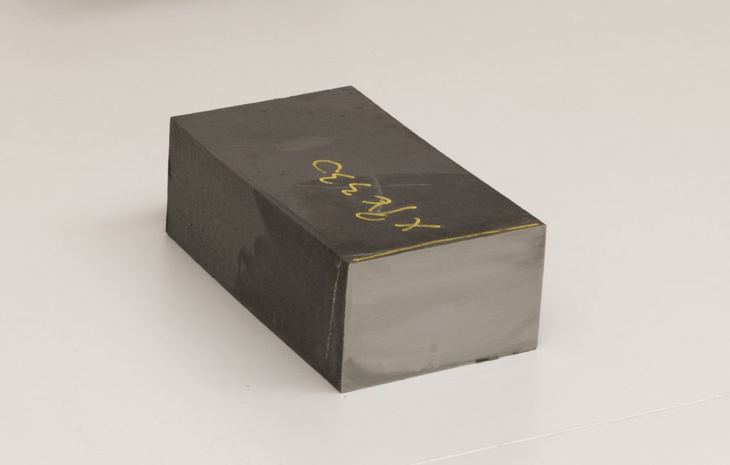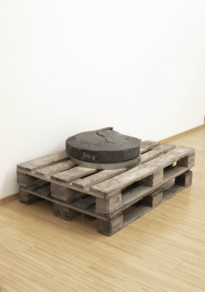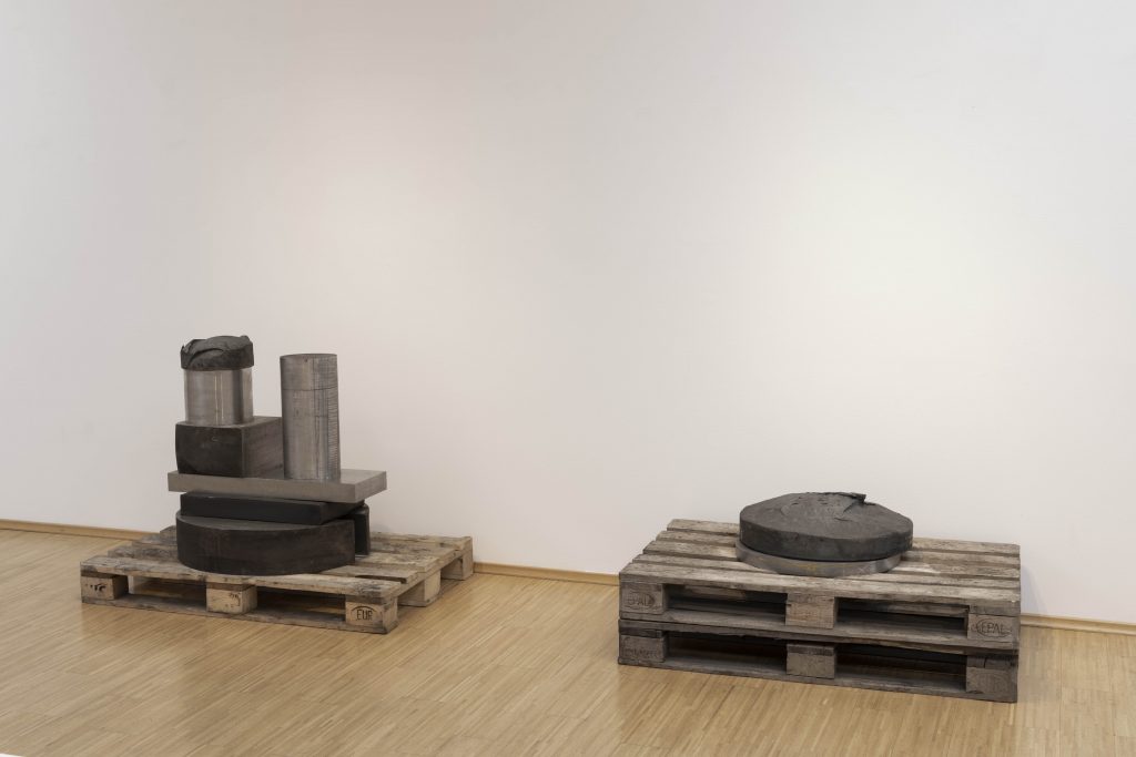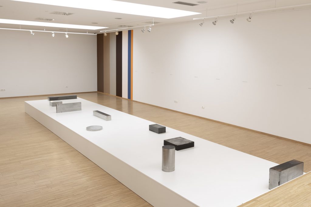 Slovenska Industrija Jekla (SIJ) is a large steel mill in Ravne, Slovenia. For the show in a local museum gallery, samples of different steel alloys were displayed—one set stacked on wooden pallets and another on a large podium. A color histogram representing “slovenska industrija jekla” developed in collaboration with Ardalan SadeghiKivi was painted on the gallery wall.
